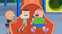 Clarence reaches into his back pocket and pulls out the fries before throwing them back at Jeff, but by accident, he spills them out onto the slide and they slide down. Clarence fears that Jeff will get mad, but instead he just tells him that he has his own personal reasons and opinions for things that he would never understand. Clarence begins to slip until then Jeff grabs him by the leg and saves him. They both ended up slide down to the bottom where all the fries are and Sumo is eating them. Mary comes up and tells them that they're playing too rough and that it's time for them to go home.