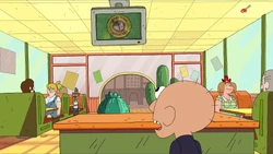 They all go to their table where Jeff takes a girly cow toy out of his bag and sighs because he not ask what he wanted. Jeff takes out his burger and throw it away where Sumo tackles the and goes to the ketchup machine, smothering the burger in ketchup. Clarence asks Jeff if he likes the Fun Dungeon, but Jeff tells him that he thinks it’s unsanitary because kids have probably vomit in there and nobody even cleans it.