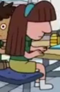 She has pale-pink skin, a broad nose, and long, straight, brown hair with bangs that cover her eyes. She wears a blue headband, white shoes, and a West Aberdale school uniform (which includes a dark green polo shirt and yellow shorts).